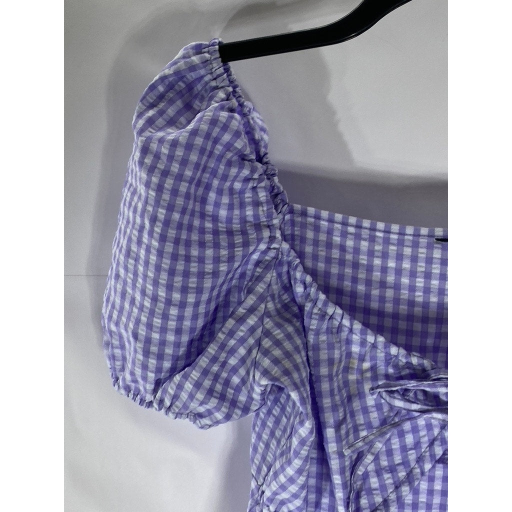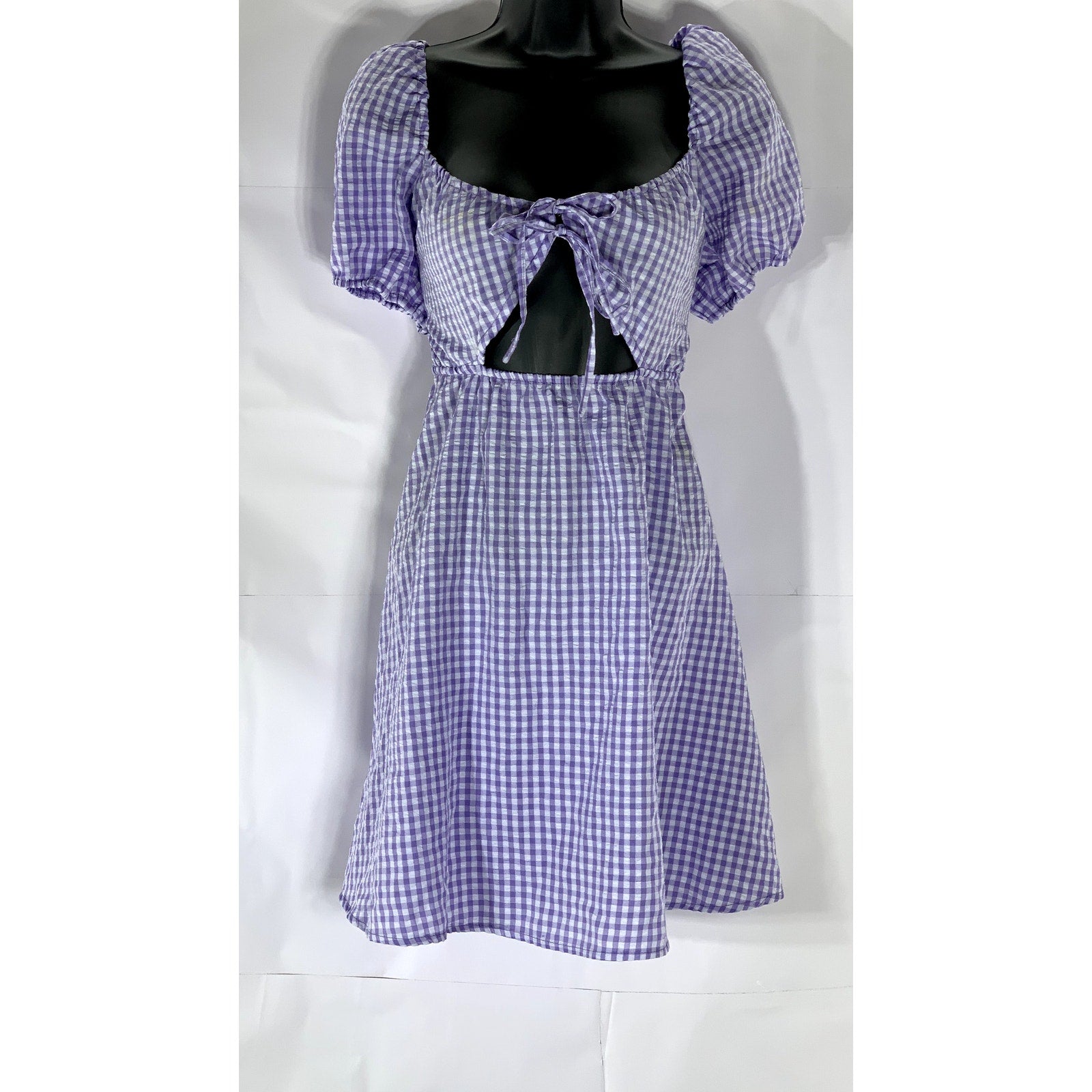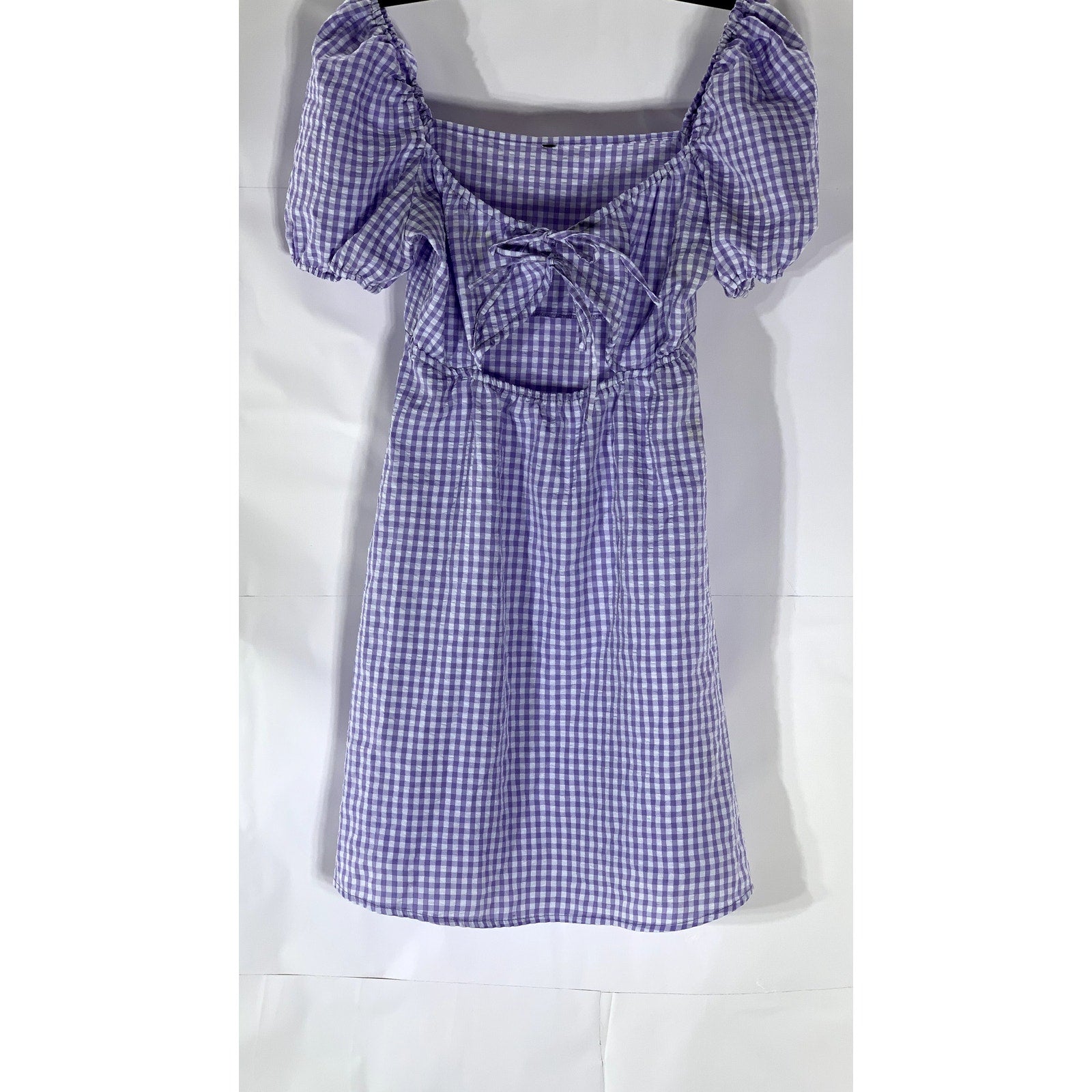 H&M Women's Purple-White Gingham Tie-Front Cutout Puff-Sleeve Mini Dress SZ XS