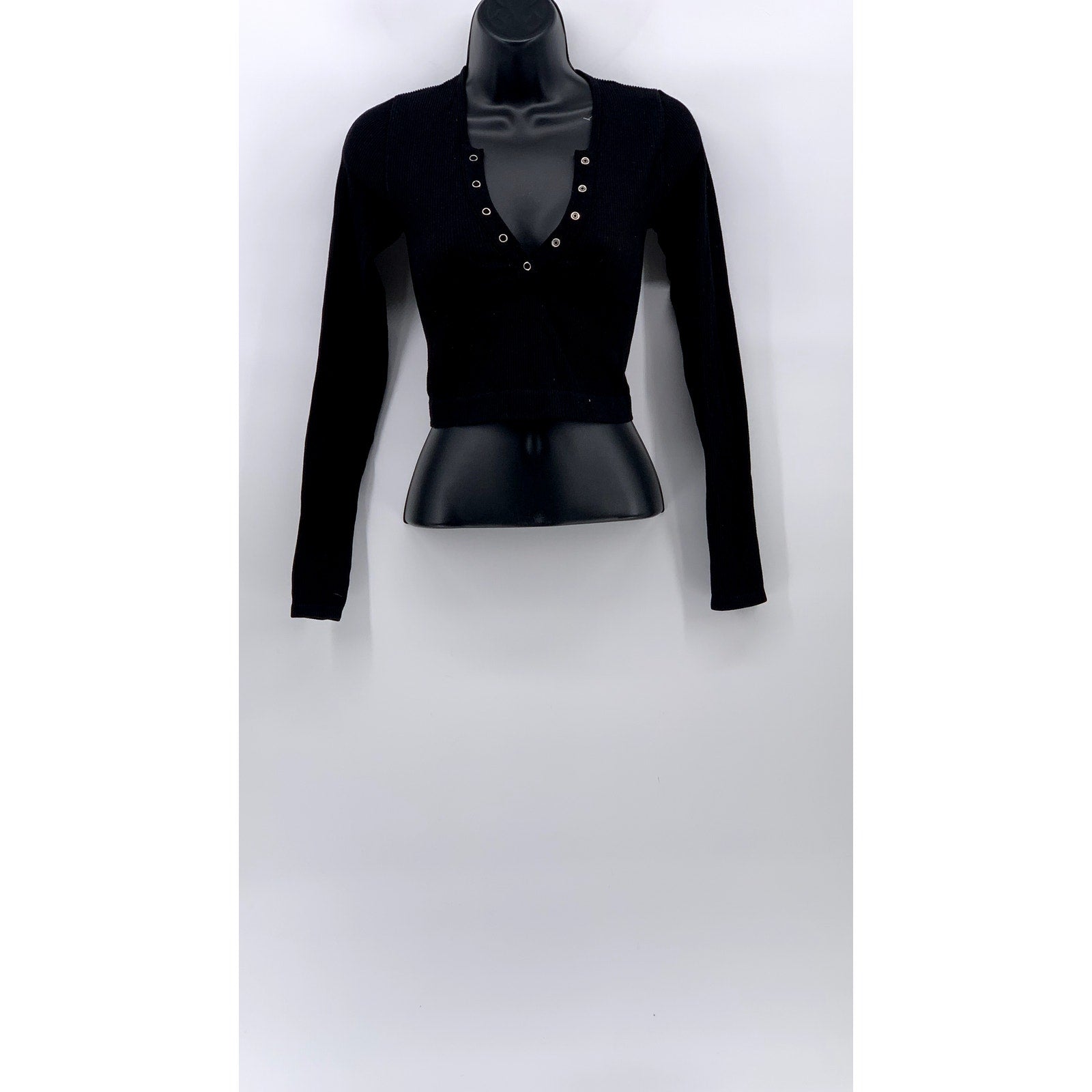 OUT FROM UNDER Women's Black Ribbed Henley Long Sleeve Cropped Casual Top SZ M