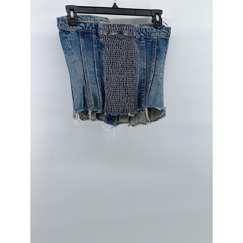 ZARA Women's Light Blue Denim Raw-Hem Button-UP Strapless Corset Top SZ M
